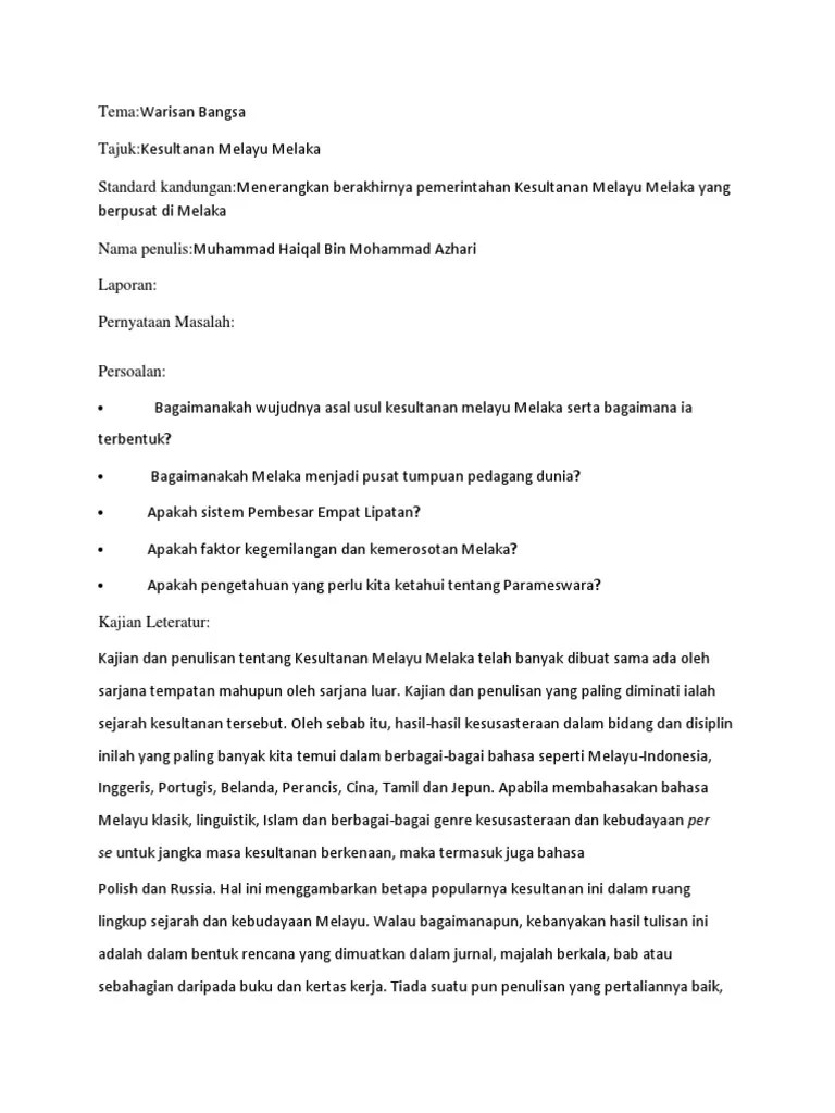 Kesultanan melayu melaka.pendahuluan peristiwa pelanduk putih dan anjing perburuan pada zaman parameswara semasa berehat di bawah pohon menjadi sejarah di malaysia apabila baginda memberikan nama melaka, bermulalah sejarah kesultanan melayu melaka dengan tempatnya yang strategik. Kedudukan geografi yang strategik : 6.1 pengurusan panitia sejarah firo har. 5.1 penerapan nilai dan patriotisme dlm sejarah firo har. 6.0 organisasi panitia firo har. 10.10.2015 · dalam kerja kursus ini, kami telah ditugaskan untuk menyiapkan dua tugasan.